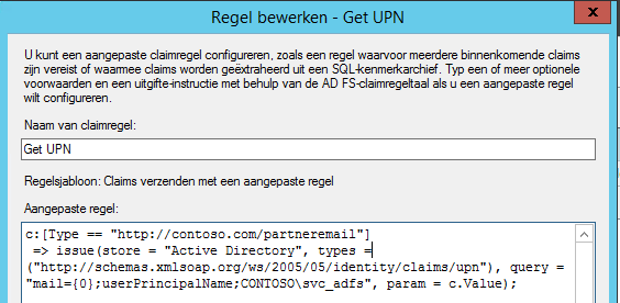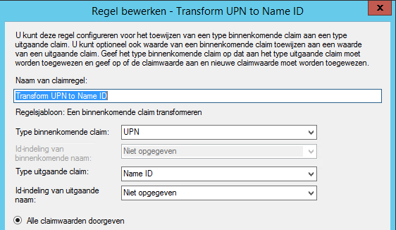 Now we’re going to make sure that we get the User Principal Name for each account that’s logging in (for both users in the resource domain as Federated users). We assume that the identity provider for the Federated users delivers his/her email address as a claim.