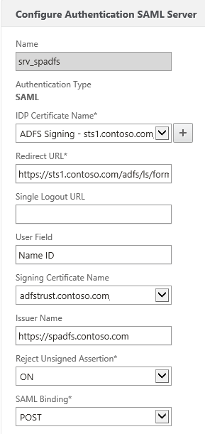 After you’ve created the Server object, you can create a SAML auth policy. As the expression, you can use “ns_true”, as the action you select the Server object you’ve just created (srv_spadfs in this example).