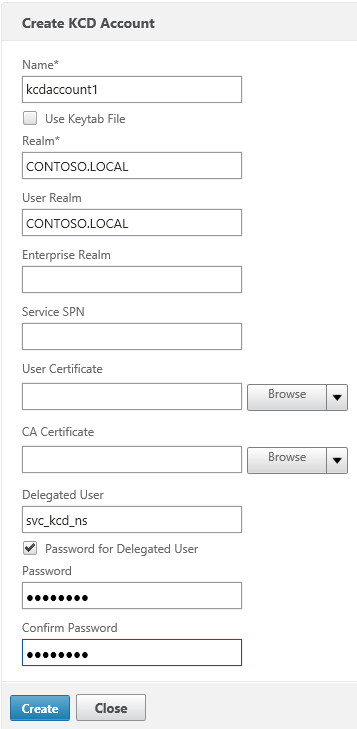 Then configure the KCD Account on the NetScaler. Under Security > AAA > KCD Accounts, add a new KCD account: