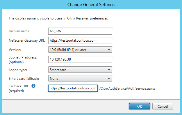 For that we’re going to (supposedly) use Smart Card authentication on the gateway. In StoreFront, add (or edit) a gateway and make sure the Logon Type is set to Smart Card. Like always, make sure that your StoreFront server can perform the callback (check that it can resolve the URL). In our environment we’re using the following settings:
